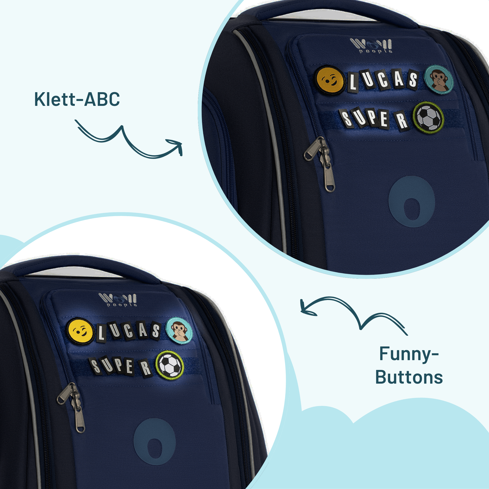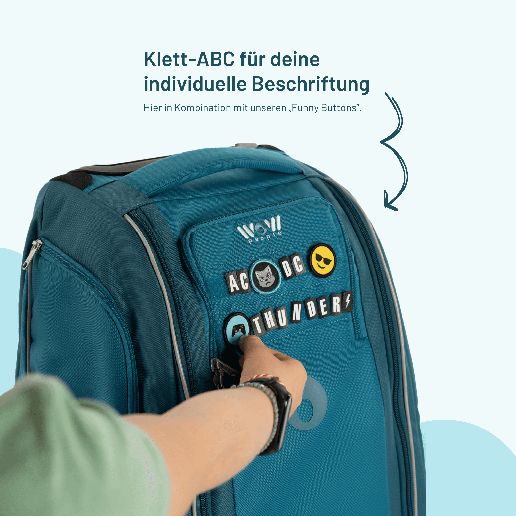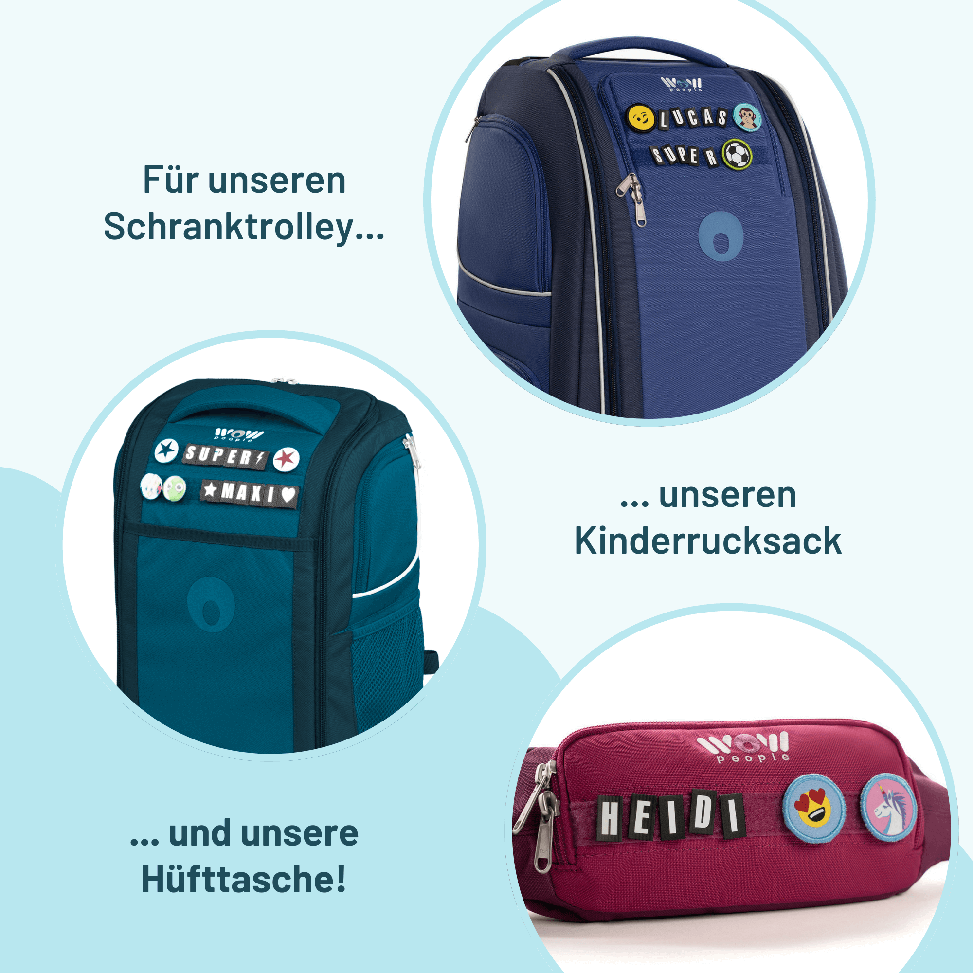 Das ist wirklich WOW! Mit dem Klett-ABC macht Ihr aus dem Schranktrolley Euren individuellen und ganz besonderen Trolley. Lustige Sprüche, Namen (auch von Sportvereinen, Städten und vieles mehr) und jeder Quatsch, der Euch einfällt, machen den Schranktrolley, den Rucksack und auch die Bauchtasche zu etwas ganz Besonderem.