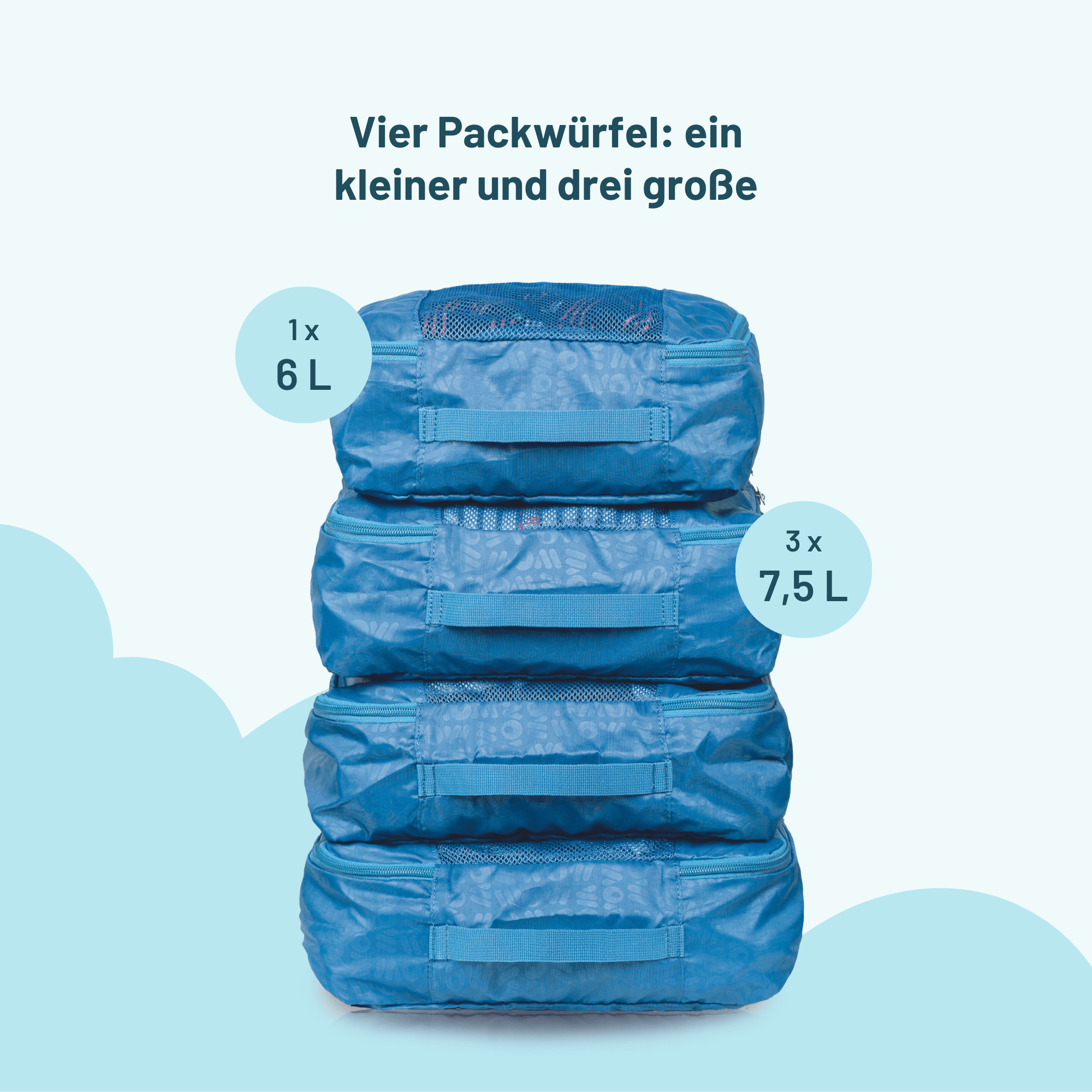 Enthält 4 Packwürfel: drei große und einen kleinen (die genauen Maße der Packwürfel findest Du unter dem Reiter 'Produktmaße & Material').